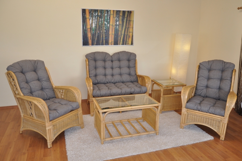 Komplettes Set bestehend aus 2 großen Rattansessel , Rattan Zweisitzer , Rattantisch und Beistelltisch .