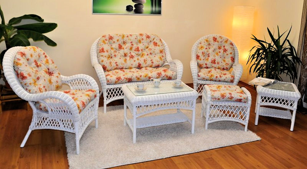 Rattangarnitur , Rattangruppe "Florida" weiß lackiert . Komplettes Set wie abgebildet inkl. Beistelltisch und Fusshocker .